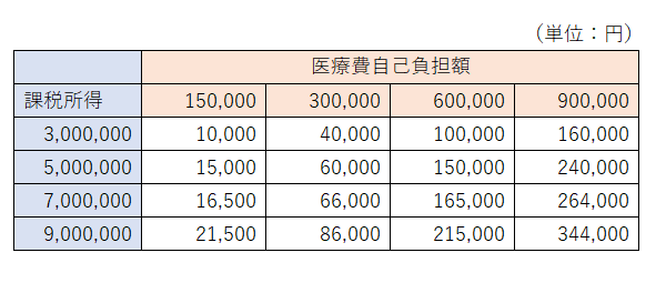 下表に、所得を縦軸(水色欄の3百万円~9百万円の4パターン)に医療費自己負担額を横軸(薄紅色欄の15万円~90万円の4パターン)にとって、白色欄で軽減される税金を試算してみました。