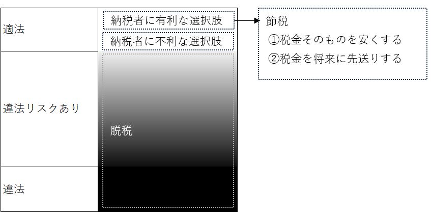 税金を安くする手法に、白(適法)、黒(違法)、グレー(違法と見られるリスクあり)とあるときに、節税とは、白の中で納税者にとって有利な選択肢を採ることをいいます。