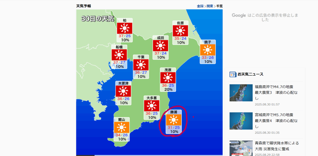 馴染みのお店のおやじさんは「今日の勝浦は暑いねー」と言っていましたが、下記県内天気図にある通り最高気温31度というのは県内他地域の身の危険を感じさせる暑さを思えば別物です。